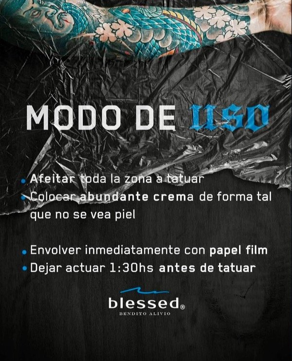 Modo de uso: afeitar la zona a tatuar, esparcir la crema, cubrir con film.